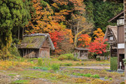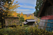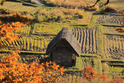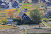 城跡から俯瞰する集落景観は、四季折々、この上なく美しい。特に、近景の和田家(重文)と、その東側、田園の中にぽつんと佇む作業小屋が秀逸である。