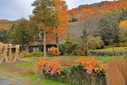 土産物店「木古里」を中心に、両脇に合掌造り民家が並んでいます。