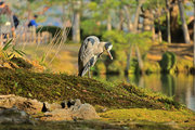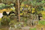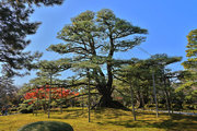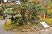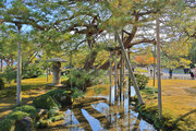 池の周辺の唐崎松は兼六園の中でも最も枝振りがよく、13代藩主・斉泰が琵琶湖畔の唐崎から種子を取り寄せて実生から育てた黒松である。