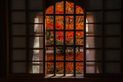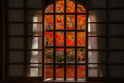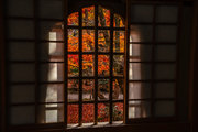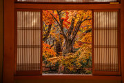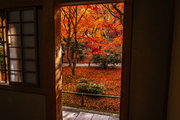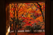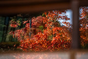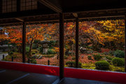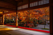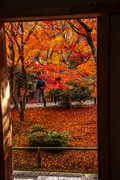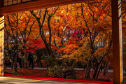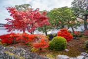 寺宝の展示:円山応挙の「雨竹風竹図」屏風(コピー)や伏見版木活字の「般若心教」(いずれも国重文)など。額縁紅葉の見事さで有名。