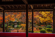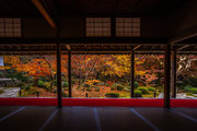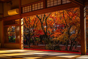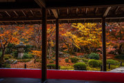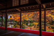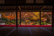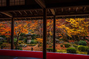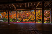 本堂の室内、縁側から見る紅葉シーズンの十牛の庭は絢爛豪華である。