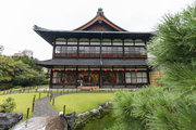 解説:木造2階建,入母屋造・瓦葺の大屋根を架けた建物で,敷地南奥に建つ。北面西側に軒唐破風付の玄関を設け,東面と南面から庭園を望む。1階は特等客向けの待合・点茶などに用いられ,2階は広大な132畳敷の客席と舞台からなる広壮な舞台座敷としている。