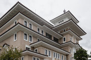 解説:鉄骨鉄筋コンクリート造,地上5階地下1階建で,南面して建つ。各階に銅板瓦葺屋根をかけ,塔屋状の正面中央部は付庇や宝形造屋根が城郭の天守を思わせる造形で,和風意匠の伝統を巧みに織り込んでいる。設計は劇場建築を手がけた木村得三郎,施工は大林組。