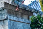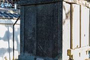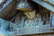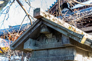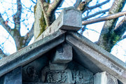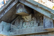 石廟側面、上部の蟇股と天女の彫刻。正面下部、檀上積基壇の羽目石には格狭間が刻まれている。松平秀康、秀康の母(長勝院)の石廟(重要文化財)も笏谷石でつくられ高野山にある