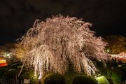 円山公園の園内中央には,通称「祇園の夜桜」という有名な桜があります。 正式名は,一重白彼岸枝垂桜(ひとえしろひがんしだれざくら)といい,現在は二代目です。「初代のシダレザクラ」は,根回り4メートル,高さ12メートル,樹齢200年余で,昭和13年,天然記念物に指定されましたが,昭和22年枯死しました。現在ある桜は,これに先立つ昭和3年に,15代佐野藤右衛門氏が初代のサクラから種子を採取し,畑で育成したものを,同氏の寄贈により,昭和24年に現地に植栽したものです。現在の容姿は,樹高12メートル,幹回り2.8メートル,枝張り10メートルです。