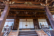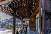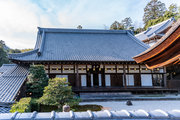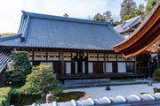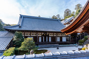 色とりどりの紅葉に覆われているもみじ参道を歩き、薬医門を目指しました。 薬医門をくぐり、書院や釈迦堂などの諸堂が建ち並ぶ一角に向かいました。 勅使門、庫裏、大書院などが建ち並んでいます。 石段を上ると大きな御影堂が見えます。