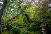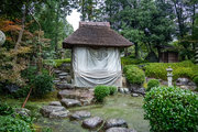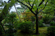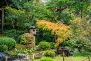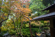 4畳半に一間床を加えた茶室 山田彦左衛門時代から、橋杭灯籠が庭石と苔の緑とで一体化している。