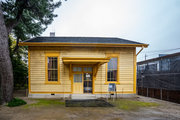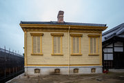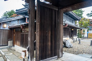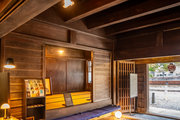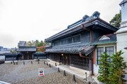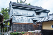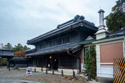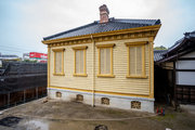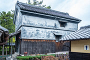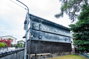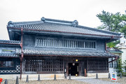 受付になっている本邸。黒漆喰塗り土蔵造り2階建での重厚な外観の建物で、店と住居に使われていた。