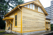 木造、建築面積219.45m2、二階建、塔屋付、スレート及び銅板葺