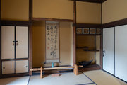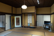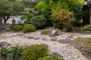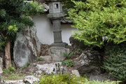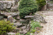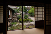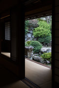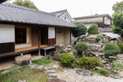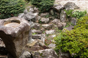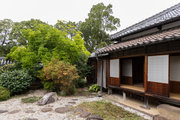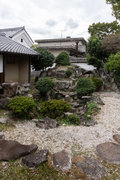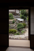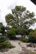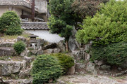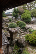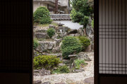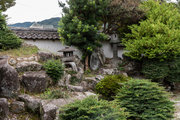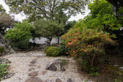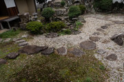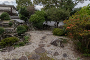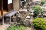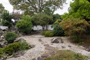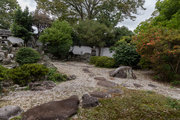 枯山水庭園、江戸時代宝永7年(1710)以後の作庭。枯滝や築山の石組とリズミカルな飛び石が渋い。