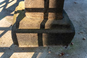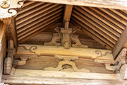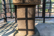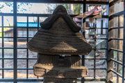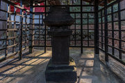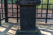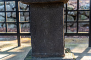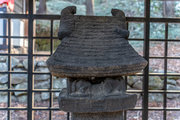 高さは117.5㎝、屋根、龕(厨子)、竿、基礎の4部からなっています。屋根は入母屋造りで大棟の左右に鴟尾(しび)も付けられています。龕は上半分が欠損していますが、正面左右には狛犬のような像が見えます。中台正面には勾欄と階段が表されています。竿石には正面に鶴・