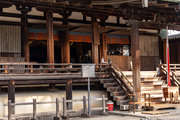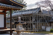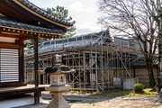屋根葺き替え工事中の講堂(平安時代)、鐘楼(平安時代)、回廊(飛鳥時代)、いずれも国宝