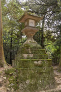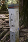 参道に着いた。鷺原道の標識と瓢箪を浮き彫りにした石燈籠がある。
