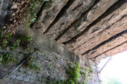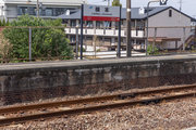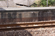 ホームの石積みの下にはレンガ積み遺構が見られる。明治時代の開業当時のホームである。
