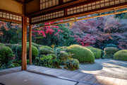 今年から時間指定の完全予約制になっていました。9時の朝一番の予約ができましたが、1回50人なので、門前に多くの人が待っていました。書院では、人が遠慮して軒先を通らなくなっているのと、ほぼ全員が書院の奥から撮影しているため、ほぼ無人の風景を撮影することができるようになっていました。