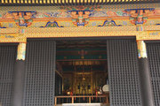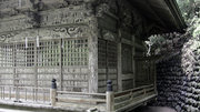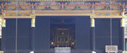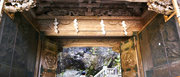 □背面 門扉は桟唐戸、上の大きな羽目板には鳳凰の彫刻