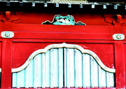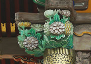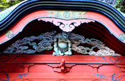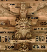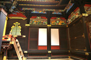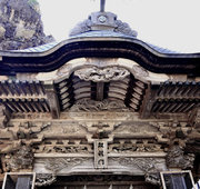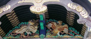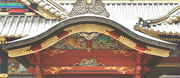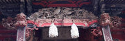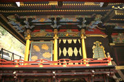 □正面 桃山風に彩色された組物 柱は円柱、金具でカバー。虹梁の木鼻は立体的に彫刻された菊の花、柱の左右の欄間に菊水や竜の彫刻(昇り竜・降り竜)