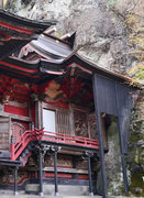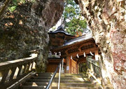 御姿岩にのめりこんでいます。御神体が岩奥に祀られています。権現造の社殿の本殿部分が春日造は珍しいとされます。