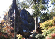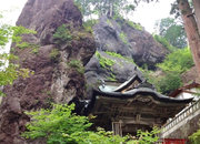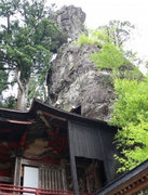 社殿の背後にそそり立ち、岩の頂部が突き出ています。