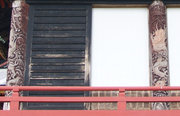 二間、左は母屋部分、右側は幣殿との接続部には火灯窓を配置、縁側四面には波打った欄干、薄肉彫による波に胴羽目に団扇・扇の図柄の装飾
