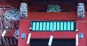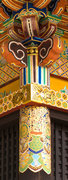 □正面 柱間は格子の引き戸、半蔀、軒下は極彩色に塗り分けてあります。組物は出組、中備に蟇股