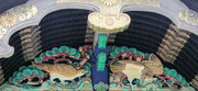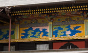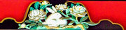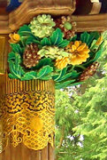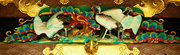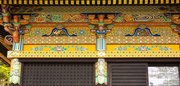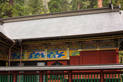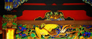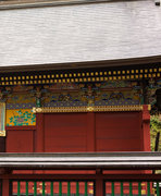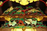 頭貫・軒桁に菱形のパターン、上下の羽目板に花と枯草、蟇股は花鳥の彫刻、柱の上部や組物は桃山風の極彩色