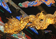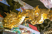 □向拝と身舎(母屋)をつなぐ海老虹梁に手の込んだ龍の彫刻 金ぴか