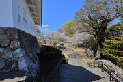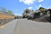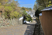 城と武家屋敷をつなぐ坂。坂の正面に城を望む。坂と両側の塀と遠景の城が調和する。