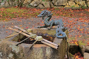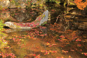 この池には滝を設け、板石橋を架け、池の中に笹舟様の舟石を置く。