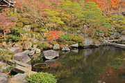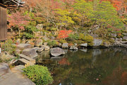 この庭は鈴鹿の山を借景に山腹を利用し、大きな池と変化に富んだ巨岩を配した豪華な池泉廻遊式ならびに鑑賞式庭園である。