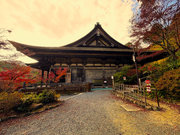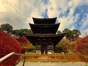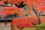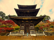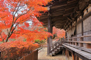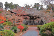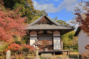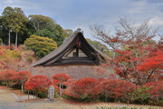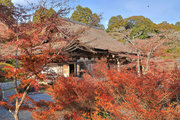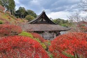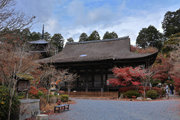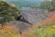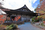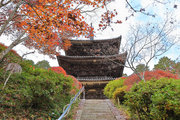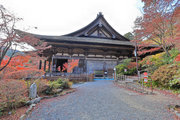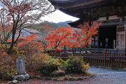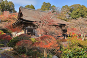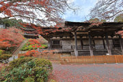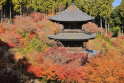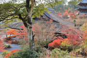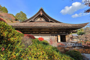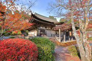 紅葉は全域にひろがるも、広い境内の温度差で、青、黄、赤と様々な色合が重なった美景を呈する。常楽寺は長寿寺のから北西約1kmにある天台宗のお寺。湖南三山の中心でもある。