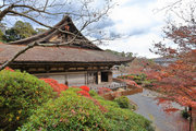 ささやかな山門の先に一直線の参道がのびる。石橋を渡ると左側にはツツジが蜜植されており、右側には本坊の建屋がある。