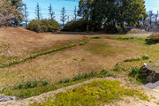 琵琶湖の方を見る。現在の石垣と石段(船着き場)がかつての湖岸であり、三上山と琵琶湖を借景とした庭園であった。