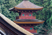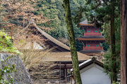 樹林を負うて三つの典雅な檜皮葺の屋根が重なり合い、三重塔がその向うに現れて長命寺の建築美が満喫できる。