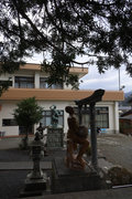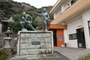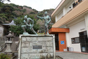 鳥居の右側には曽我兄弟仇討ちの像。仇討に相応しい勢いのある象である。もともとは河津駅前にあったが2025年に境内に移されて、親子が同じ境内で対面。仇討の時に名乗ったのは「曽我に非ず河津の子」と河津一族の血を名乗っている。