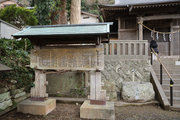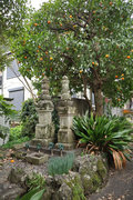 本殿の横には二つの慰霊墓。河津三郎祐泰夫妻。背後にたわわに夏ミカンが実って人の訪ずれない暗い境内にわずかの明るさを足していた。