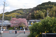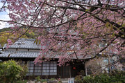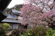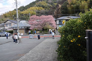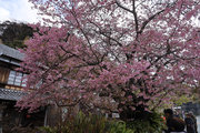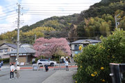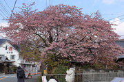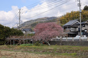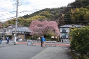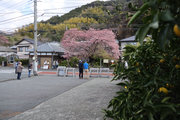 川津来宮神社の鳥居の右側の農道を曲がりくねって道なりに山の方に向かうと、原木桜が見えてくる。たくさんの人がいる。民家の前、結構車の多い道路に面しているので、交通整理の方もいらっしゃる。桜は大きい幹を中心にして何本もの枝が伸び、それぞれが見事に花を咲かせている。飯田家が半分は隠れ、お隣の家も半分は隠れ、後方の山に負けず劣らずの勢い。自撮りする人、たたずみ見上げる人、携帯を向ける人、反対の道路にはミカンの木があり、黄緑黄色桜の桃色と工夫をして撮る人。