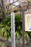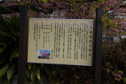 『昭和30年頃の2月のある日、この家の主人であった飯田勝美氏が、河津川沿いの冬枯れの雑草の中で芽吹いていた約1㍍位に育った桜の若木を偶然見つけて、庭先に植えたのが始まりでした。約10年後の昭和41年1月下旬、やっと花が咲き始めました。同年4月、主の勝美氏は花が咲くのを見届け永眠しました。その後、きれいに咲く桜を見て譲ってほしいという話もありましたが、思い出の桜のため手放さなかったそうです。当時、この家の屋号からこの桜は「小峰桜」と呼ばれ親しまれていました。その後の調査で、新種の桜とわかり、昭和49年に河津で生まれた桜であることから「河津桜」と命名され昭和50年4月に河津町の木に指定されました。』(原文)