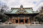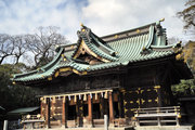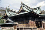 拝殿 桁行七間、梁間四間、一重、入母屋造、正面千鳥破風付、向拝三間、軒唐破風付、銅板葺