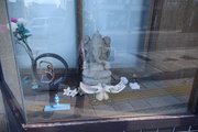 神明宮境内には昔の神輿(?)でしょうか、神社の拝殿の前にポツンと二基、置かれてありました。素朴な形と彫り物です。夜には渡御があるそうですが、この神輿もかつがれていくのでしょうか。