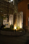 ファサード以外は現代的ですので、大正モダンのどっしりとした重みのファサードが、建物にうまくマッチしているのかどうかは素人の私にはよくわかりませんが、一部分でも残っているのはありがたい感じがします。ファサードは左右対比のバランスも良く、ステンドグラスなどとても美しく日に映えて輝いています。歴史的な重みが充分に保存されていて嬉しいな、と思います。ビルの中からのステンドグラスも見てみたい気がしましたが、「見ることはできない」というビル側の返答でした。