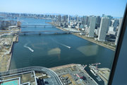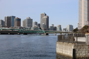 晴海橋の中央区側で北東を見るとスカイツリーが見えます。また晴海橋から南の東京湾のほうに1つ寄った橋(新晴海大橋)に行くと、真っ青な海の上に茶色の小さな鉄道橋と右手のビル群の間にスカイツリーが見えます。