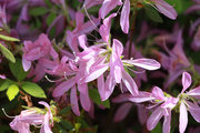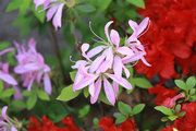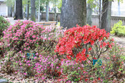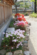 拝殿の龍の彫刻も見事。本殿の裏に回ると花々がきれいに植栽されている。各町の神輿は三角の屋根を並べた収納庫の中に。