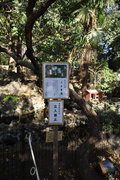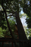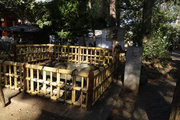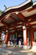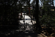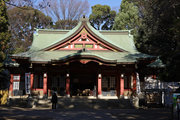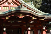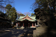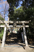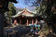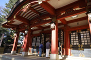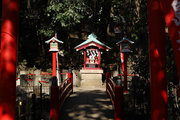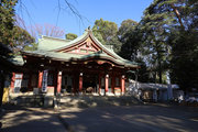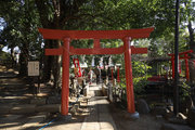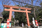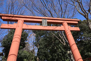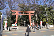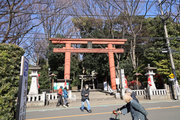 小田急小田原線「豪徳寺」を下りて、猫にちなむ豪徳寺なので商店街のウィンドーに招き猫もおおく、猫商店街を楽しみながら、線路に沿って豪徳寺方面に歩くこと15分。線路があり、これは東急電鉄世田谷線。「宮の坂」の駅が前方に見えてきたところで踏切を渡る。少し直進すると正面に大きな赤い鳥居。なんだか村の鎮守様に来たような、まったり感がある。