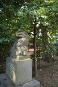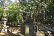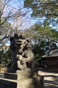 狛犬は1877(明治10)年に奉納されたもの。子どもの狛犬は左右ともども親の狛犬を見上げている。しっぽは二つに割れる特徴がある。