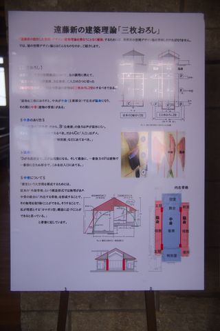 木造、建築面積639.6㎡、一部二階、東西翼屋及び半地下付、切妻造、鉄板葺