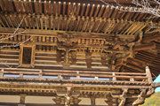 トキョウは和様三斗組、正面 の中備えにして束の足元に渦巻絵様の笈形をつけているのはいかにも和様らしい構造である。